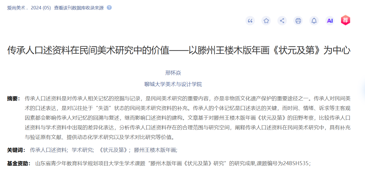2024年10月论文《传承人口述资料在民间美术研究中的价值——以滕州王楼木版年画〈状元及第〉为中心》发表于《爱尚美术》;