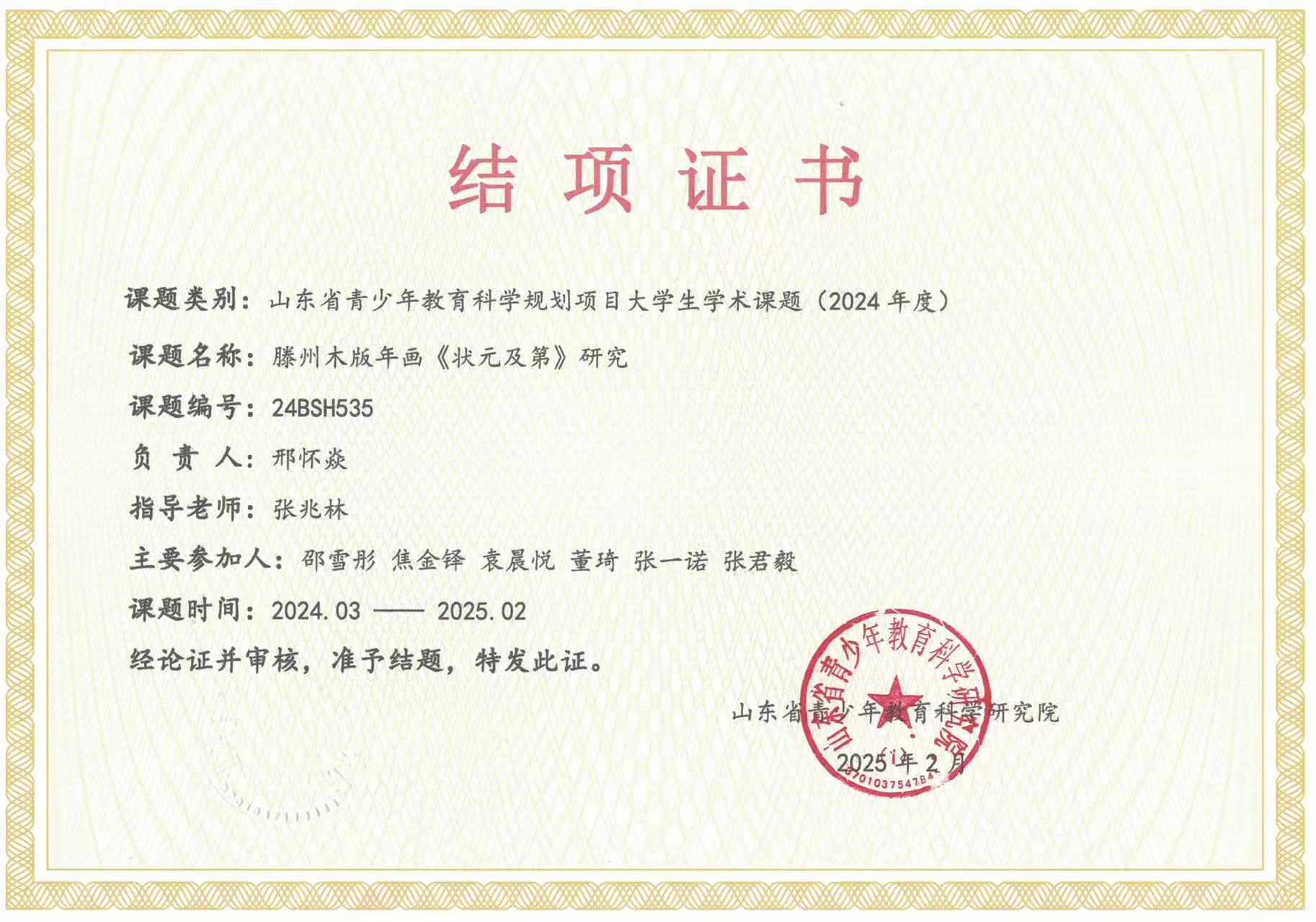 2025年2月主持并结项2024年山东省教育科学规划项目大学生学术课题《滕州木版年画〈状元及第〉研究》;