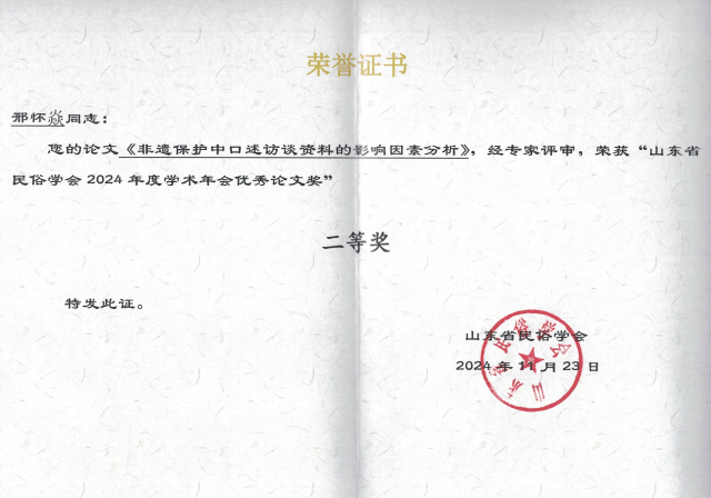 2024年11月荣获山东省民俗学会2024年度学术年会优秀论文二等奖;