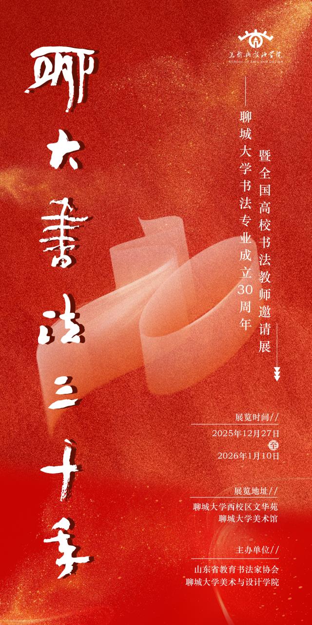 聊城大学书法专业成立三十周年暨全国高校书法教师邀请展 作者:李媛 来源:美术与设计学院 发布时间:2025-12-22 阅读次数: 展览时间:2025年12月27日至2026年1月10日 展览地点:聊城大学西校区文华苑 主办单位:山东省教育书法家协会、聊城大学美术与设计学院 审核 崔洁康 杨凯琪
