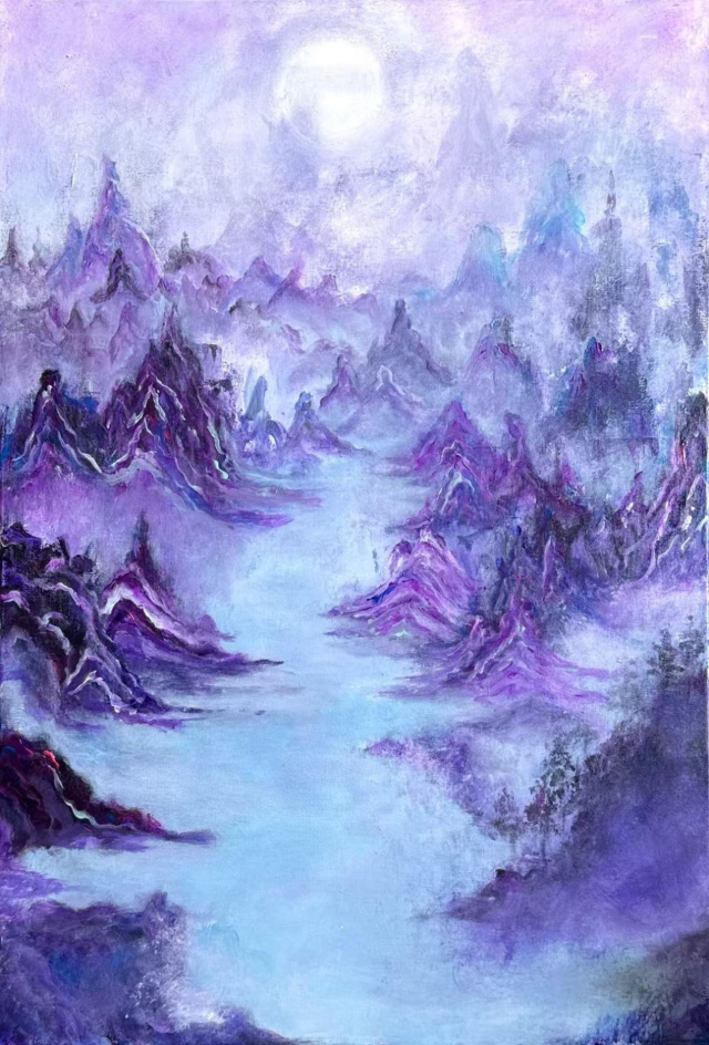 《秘境·紫烟》以当代抽象山水为核心,重构传统东方山水的意境表达,融合西方油画的色彩肌理与东方水墨的空灵气韵,借紫、蓝交织的梦幻色调,传递山水间“虚实相生、静穆悠远”的精神内核,探索传统美学与现代艺术语言的融合路径。