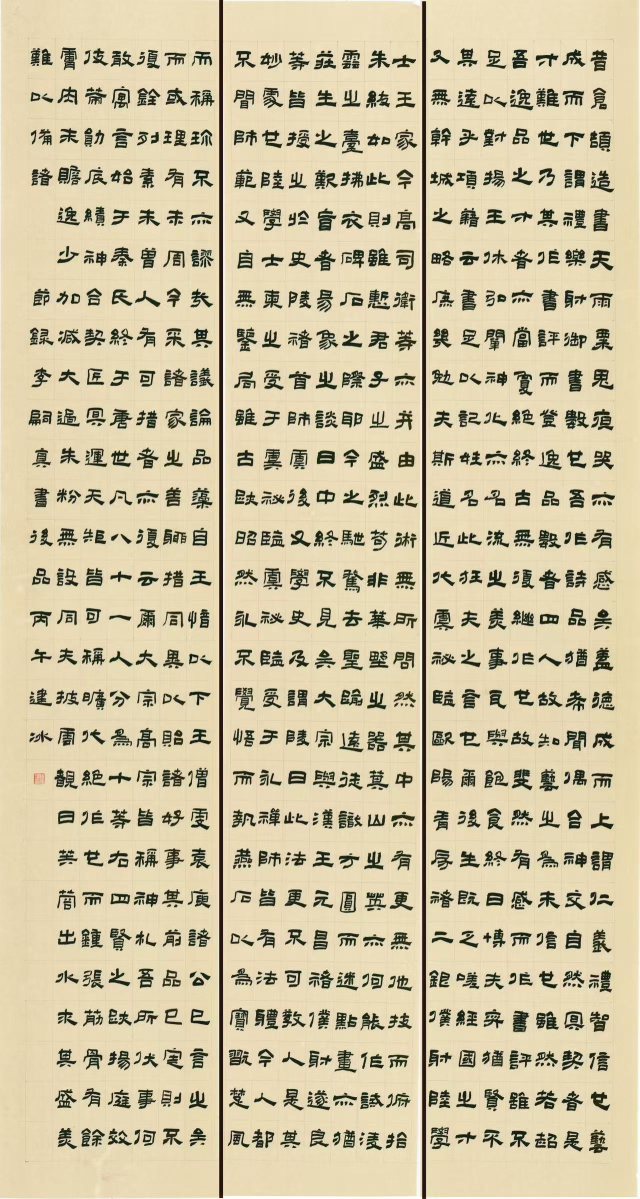 此作品为隶书三屏通栏书写,整体呈现出学古不泥、稳中求变的艺术特征,用笔精谨扎实、章法规整大气,兼具传统汉隶的朴厚与清代隶书的灵动,笔画锐利干脆,横画起笔方整有力三列竖排布局严整,行列对齐清晰,字距均匀,章法森严;字形大小虽有自然变化,但整体气脉贯通,完美还原原碑“法度严谨、气脉连贯”。