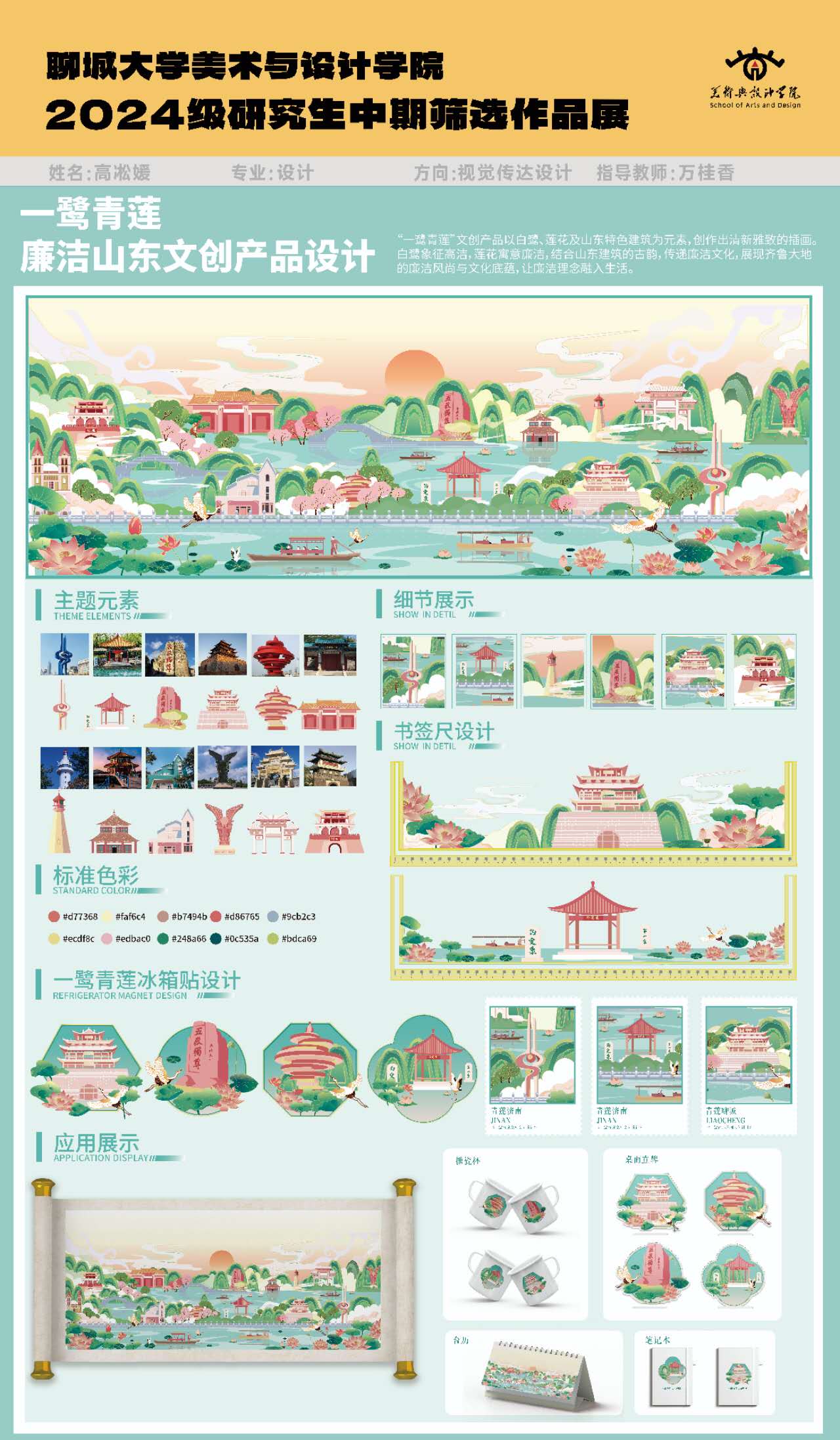 本设计以“一鹭青莲”为核心,取“一路清廉”谐音,将廉洁文化与山东地域特色深度融合。以白鹭、莲花为核心符号,象征高洁清正,提取济南、泰安、聊城等山东标志性建筑为视觉载体,用清新雅致的国潮插画风格,打造全景式主视觉画面。