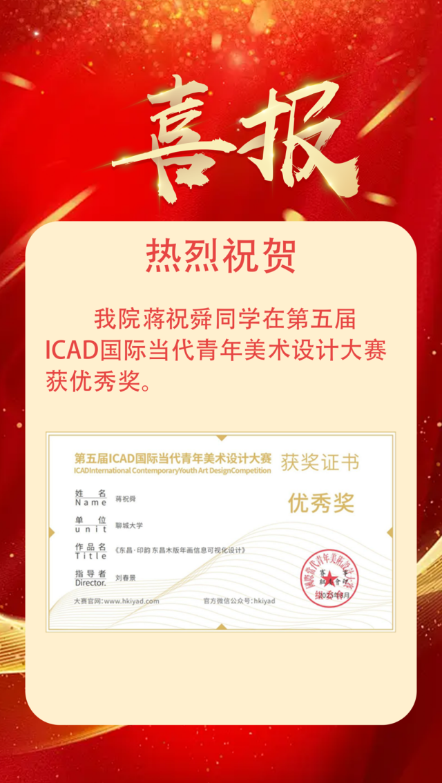 喜报|恭喜我院学子获得第五届ICAD国际当代青年美术设计大赛优秀奖 作者:么翠红 来源:美术与设计学院 发布时间:2025-11-25 阅读次数: 恭喜蒋祝舜2025.08 第五届ICAD国际当代青年美术设计大赛优秀奖 (审核 孔德滕)