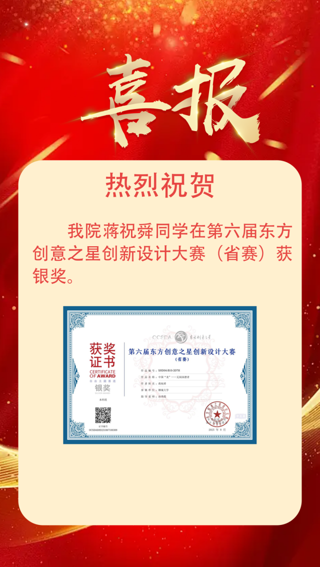 喜报|恭喜我院学子获得第六届东方创意之星创新设计大赛(省赛)银奖 作者:么翠红 来源:美术与设计学院 发布时间:2025-11-25 阅读次数: 恭喜蒋祝舜2025.08 第六届东方创意之星创新设计大赛(省赛)银奖 (审核 孔德滕)